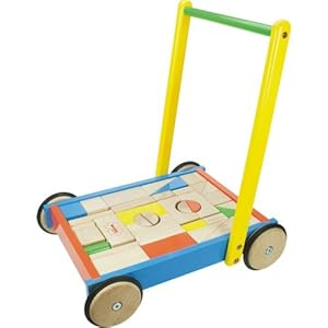 Fantastic childrens toddler push along toy for when the little ones are just starting toddling. Comes with loads of multicoloured wooden building blocks for hours of fun. 40cm tall, tray is 40cm x 32cm. RECOMMENDED 12 MONTHS +