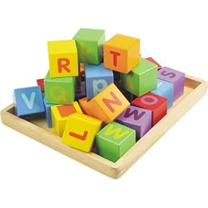 30 Colourful wooden blocks in wooden tray. All letters of the alphabet + 4 blocks with shapes. Blocks are 4x4x4cm. 12 months+
