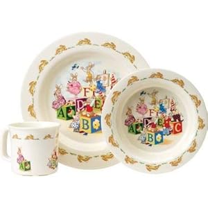 - A lovely, colourful dinner set that comes with an alphabet/bunny-themed design